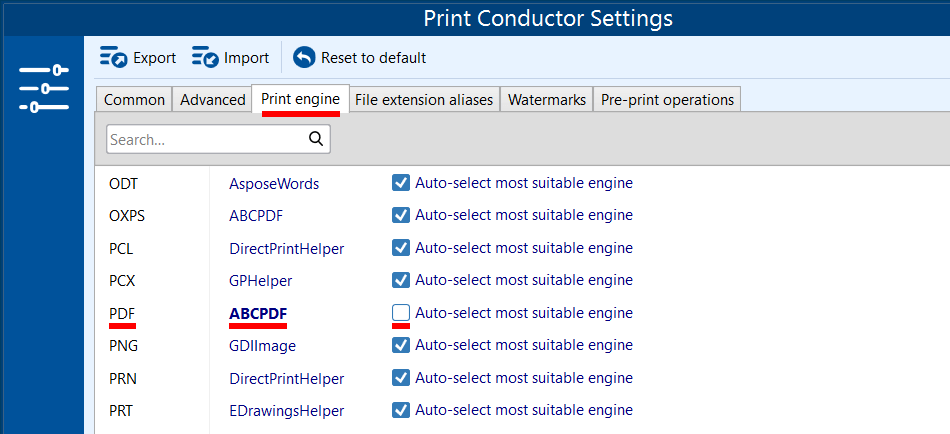 - Select ABCPDF as the Print engine for PDF documents (and disable Auto-select most suitable engine).