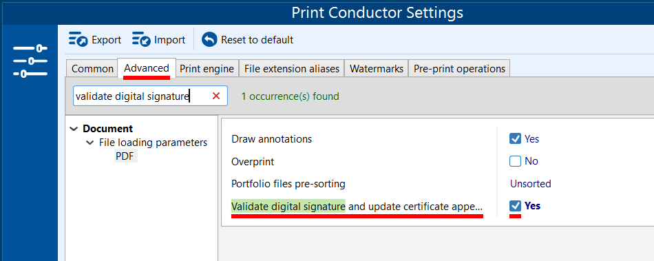 - Switch to the Advanced Settings tab, look for an option "Validate digital signatures and update certificate appearance" and make sure it's enabled. This tells Print Conductor to verify each PDF's signature while printing.