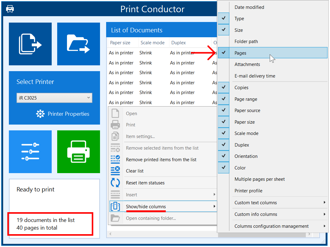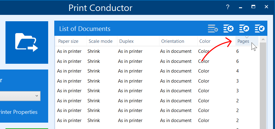 Once enabled, you can click the Pages column header to sort your documents by length (ascending or descending), helping you organize your printing queue based on page count.