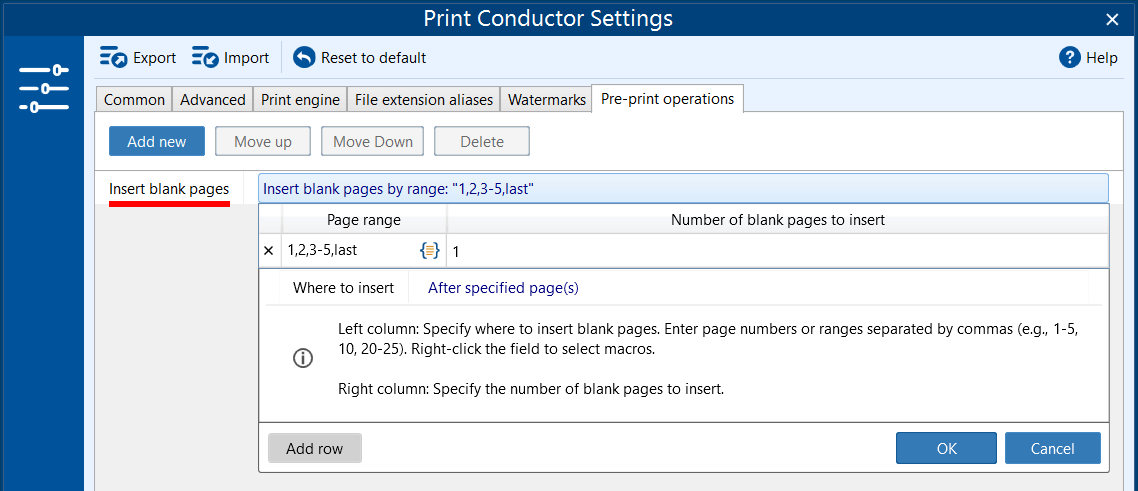 When specifying Page range, you may adjust blank page placement by using built-in macros. Use them by clicking the {=} icon: