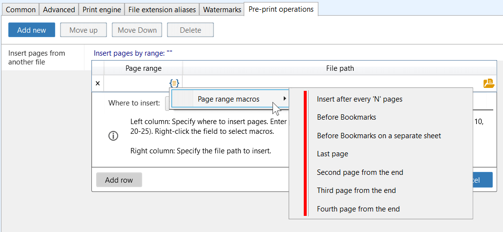 To define the file position (Page range), you can enter a page number or page range manually, or right-click in the left column and select the required macro from the Page range macros list.